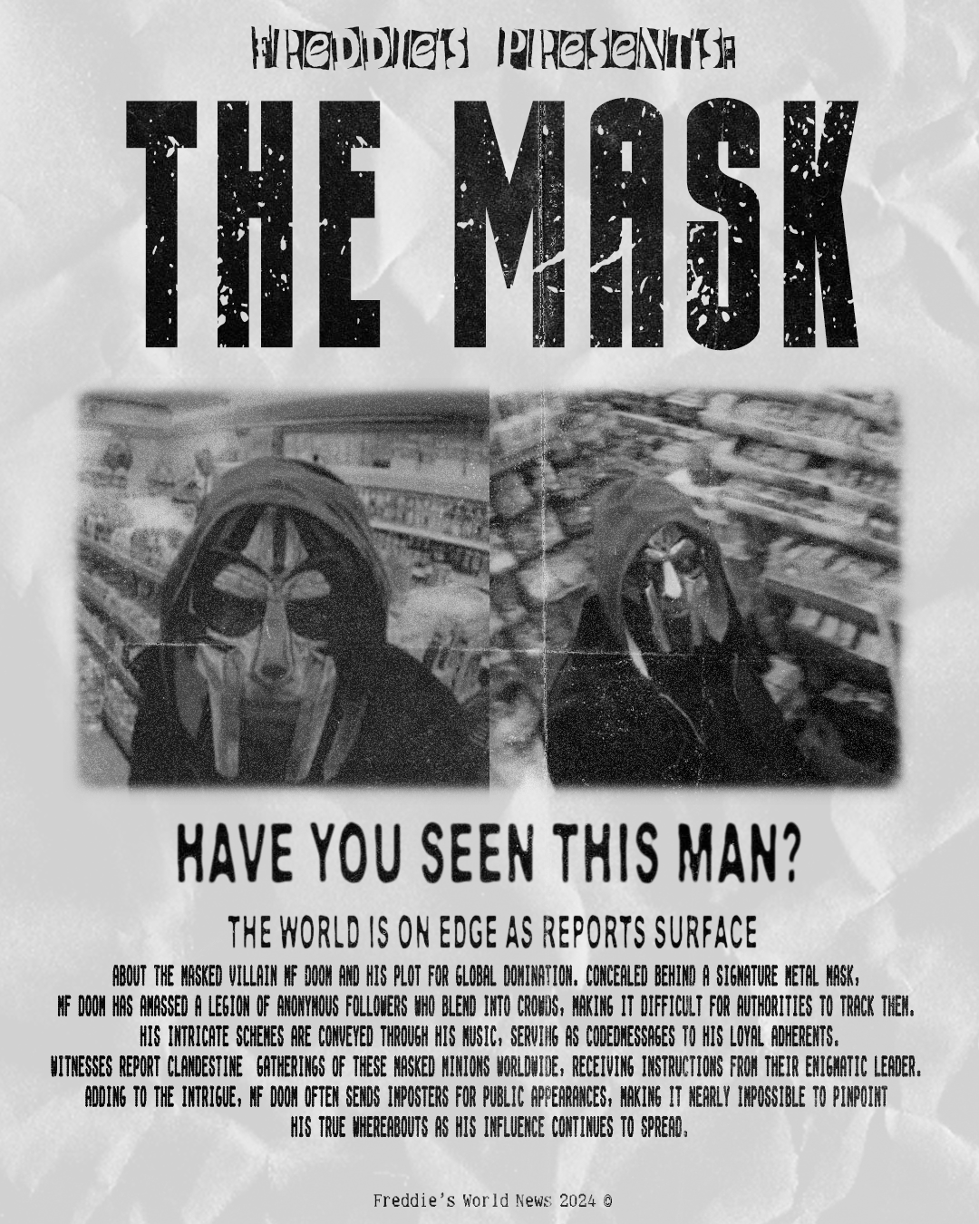 The world is on edge about the masked villain MF DOOM and his plot for global domination. Concealed behind his signature mask, MF DOOM has amassed a legion of anonymous followers who blend into crowds, making it difficult for authorities to track them. His intricate schemes are conveyed through his music, serving as coded messages to his loyal adherents. Witnesses report clandestine gatherings of these masked minions worldwide, receiving instructions from their enigmatic leader. Adding to the intrigue, MF DOOM often sends imposters for public appearances, making it nearly impossible to pinpoint his true whereabouts as his influence continues to spread.